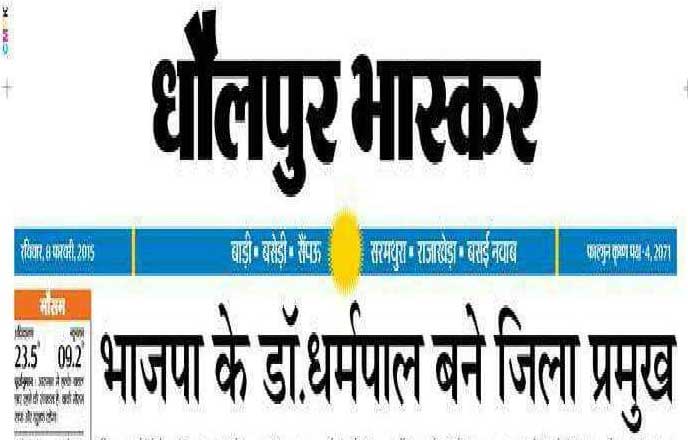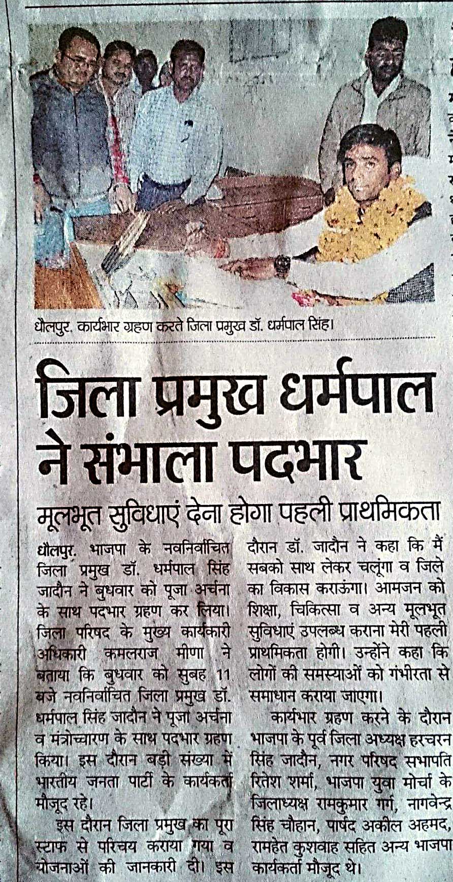 जनवरी 2015 को डॉ धर्मपाल सिंह जी का नाम भाजपा की तरफ से जिला प्रमुख, धौलपुर के लिए चुना गया और 8 फ़रवरी 2015 को जिला प्रमुख धौलपुर चुने गए और 11 फरवरी को शपथ ले कर कार्यभार संभाला।