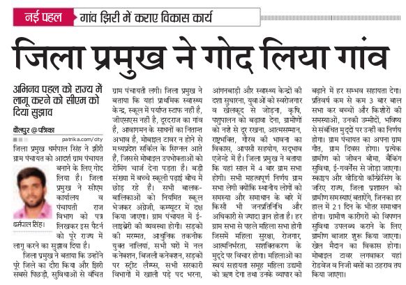 जिला प्रमुख का कार्य सँभालने के बाद श्रीमान डॉ. धर्मपाल सिंह ने राजस्थान में नई पहल करते हुवे ग्राम झिरी (पंचायत समिति बड़ी) को गोद लिया, और गांव गोद लेने वाले राजस्थान के प्रथम जिला प्रमुख है।